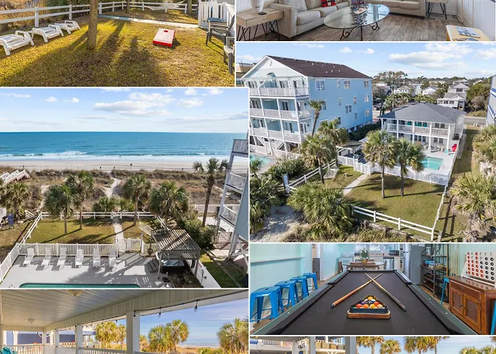 Located only 9 minutes' walk from the Lost Treasure Golf, the 4-bedroom Lavish Accessible, On Ocean, 4 King Beds, Huge Private Pool, Yard, Spa, Patio, Bbq, & Game Tables Myrtle Beach villa invites guests to enjoy a Jacuzzi. This beachfront holiday home features opportunities for mini golf, ping-pong, and billiards in the area, 4.2 km from the public Alabama Theatre.